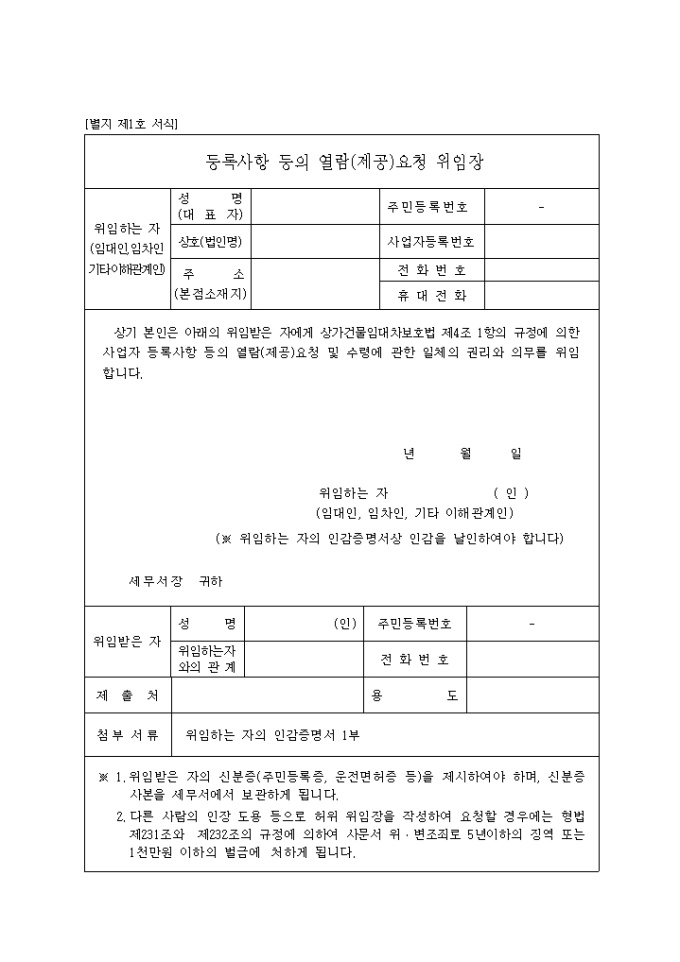 9,000원/월제1호 등록사항등의열람(제공)요청위임장 상기 본인은 아래의 위임받은 자에게 상가건물임대차보호법 제4조 1항의 규정에 의한 사업자 등록사항 등의 열람(제공)요청 및 수령에 관한 일체의 권리와 의무를 위임합니다. 년 월 일 위임하는 자 ( 인 ) (임대인, 임차인, 기타 이해관계인) (※ 위임하는 자의 인감증명서상 인감을 날인하여야 합니다)