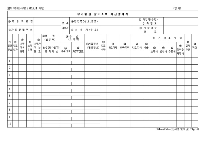 9,000원/월별지 제30호(2) 유가증권양도소득지급명세서로 양도수량,양도가액,취득가액,양도차익,세율,원천징수세액을 기록합니다. (2003.4.14. 개정)
