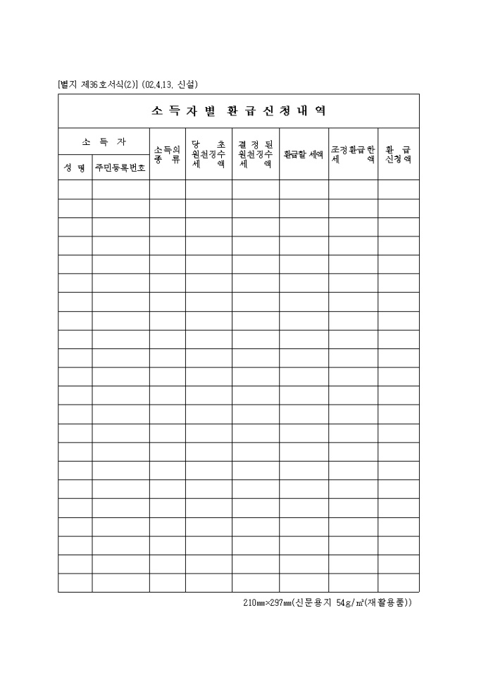 9,000원/월별지 제36호(2) 소득자별환급신청내역로 소득종류,당초원천징수세약,결정된 원천징수 세액,환급할 세약,조정환급한 세약,환급신청액을 기록합니다. (2002.4.13. 신설)