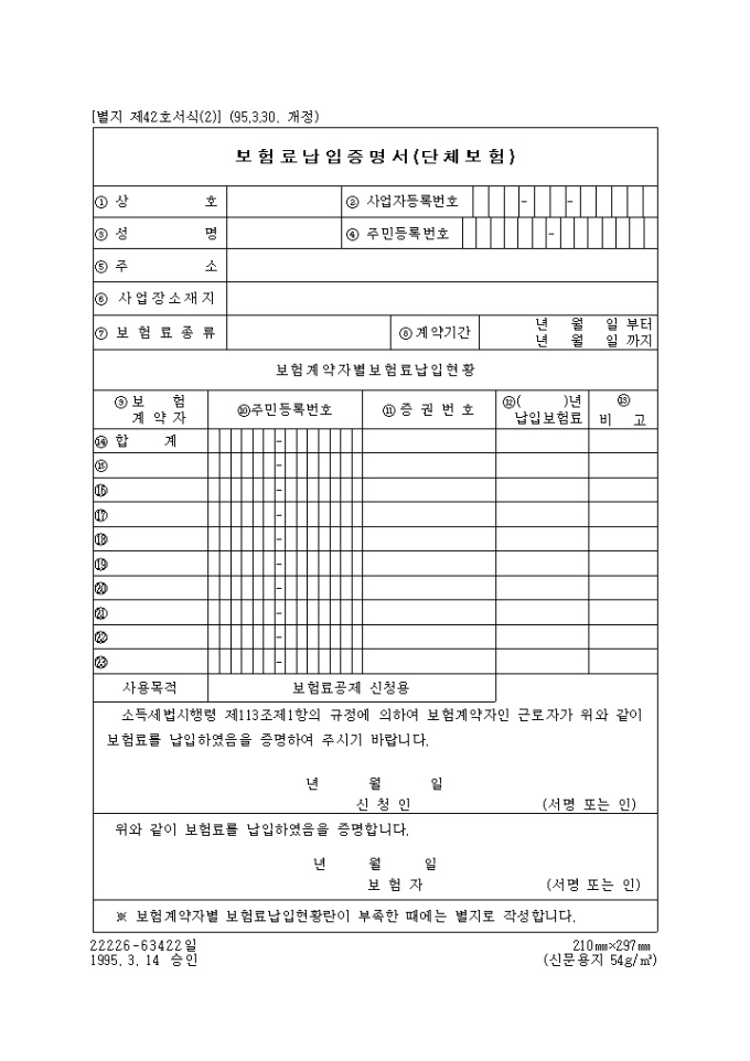 보험료납입증명서(단체보험)(제42호(2))(1995.3.30. 개정)