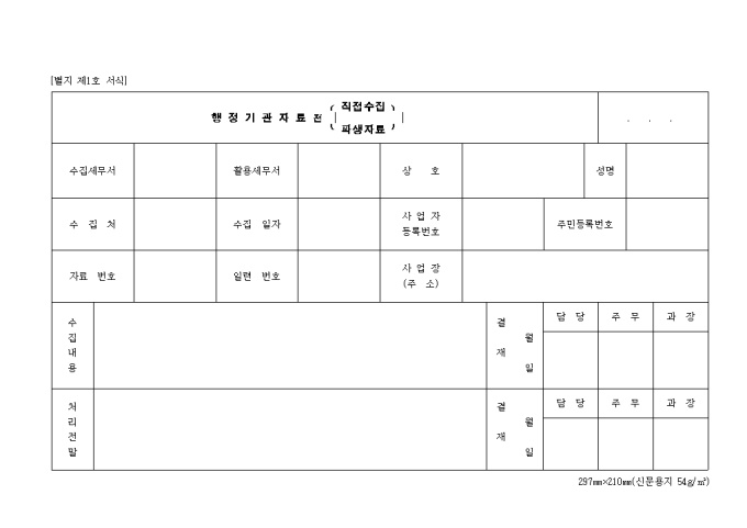 9,000원/월제1호 행정 기관 자료 전직접수집(파생자료) 양식입니다. 수집 세무서, 활용 세무서, 상호, 수집처, 수집일자, 사업자 등록번호, 자료 번호, 일련번호, 사업장 등을 기재합니다.