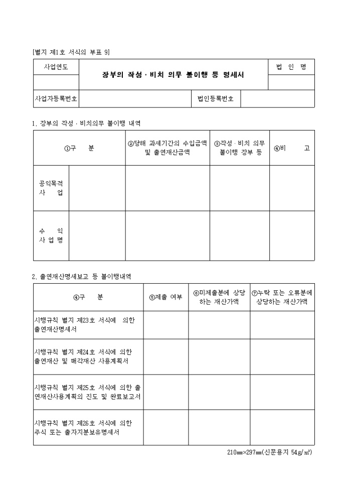 1. 장부의 작성 비치의무 불이행 내역