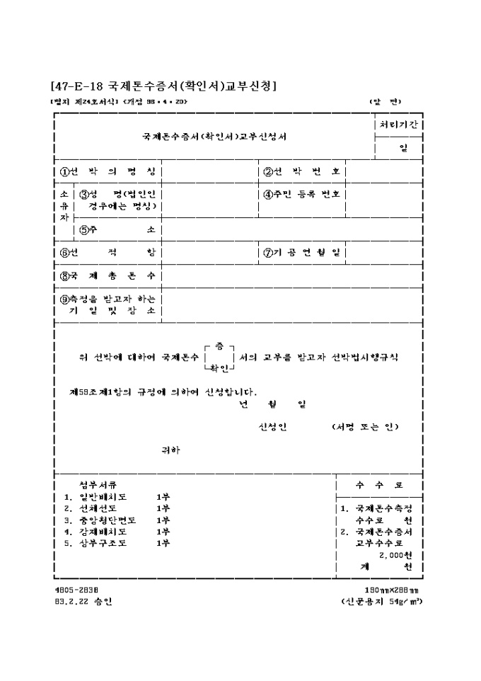 9,000원/월위 선박에 대하여 국제톤수 (증, 확인)서의 교부를 받고자 선박법시행규칙 제59조제1항의 규정에 의하여 신청하고자 할 때 사용하는 국제 톤수증서(확인서) 교부신청서 양식입니다.