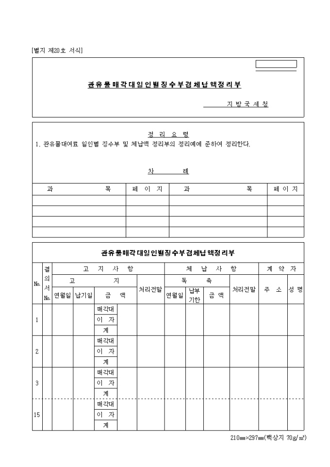 제20호 관유물 매각대 일인별징수부 겸 체납액 정리부 양식입니다. 고지사항, 체납사항, 계약자 인적 사항 등을 기재합니다.