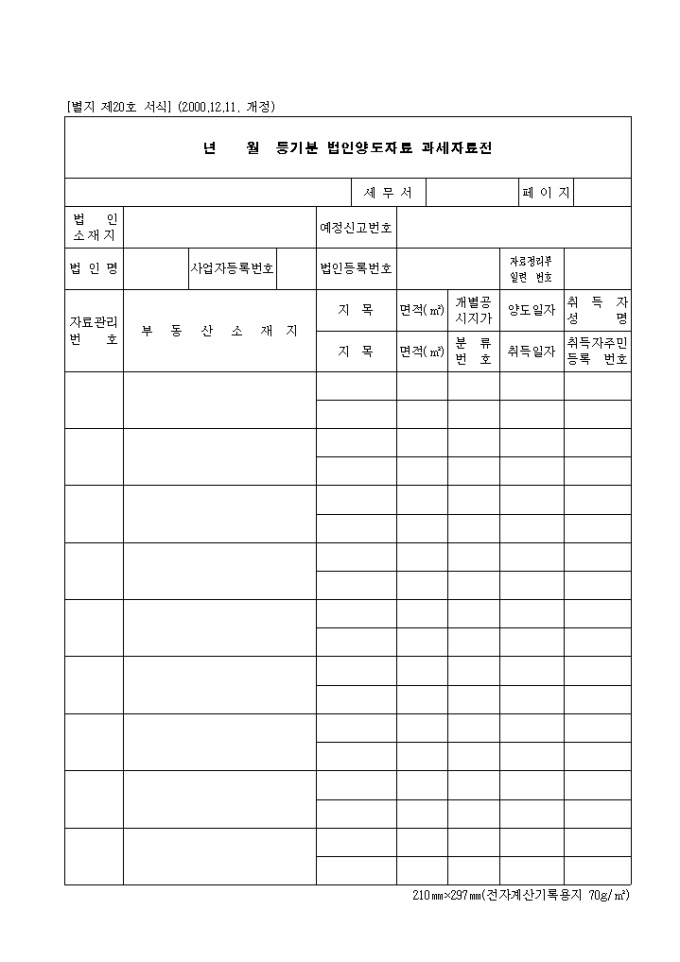 9,000원/월제20호 년 월 등기분 법인 양도 자료과세 자료전 (2000.12.11. 개정) 양식입니다. 법인 소재지, 예정 신고번호, 세무서, 법인명, 사업자 등록번호, 법인 등록번호, 자료관리 번호, 부동산 소재지, 지목, 면적, 개별공시지가, 양도일자, 취득자 성명 등을 기재합니다.