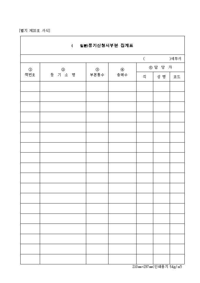 책번호, 등기소명, 부본통수, 총매수, 담당자 등을 신청하여 집계하는 제20호 등기신청서부본집계표 양식입니다.