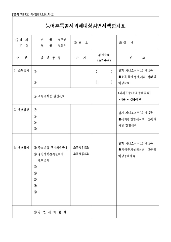 9,000원/월별지 제68호 농어촌특별세과세대상감면세액합계표로 소득공제,세액감면,세액공제를 기록합니다. (2003.4.14.개정)