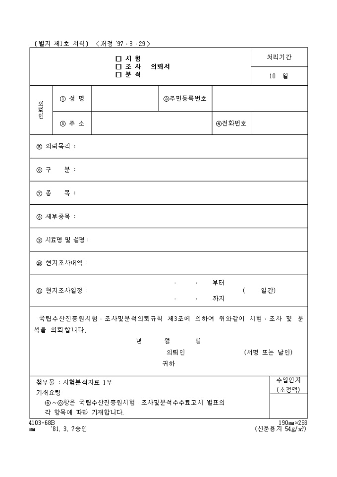 9,000원/월국립수산진흥원시험․조사및분석의뢰규칙 제3조에 의하여 위와같이 시험․조사 및 분석을 의뢰할 때 사용하는 "기타 어구 및 자재의 적용성과 성능시험(조사,분석)의뢰서" 양식입니다.