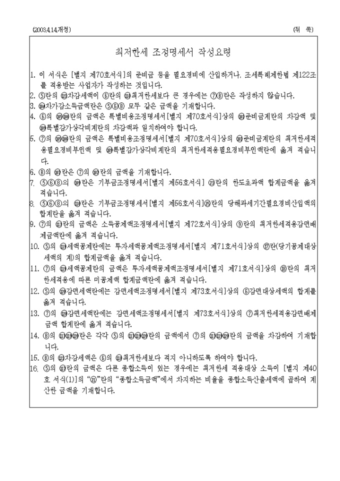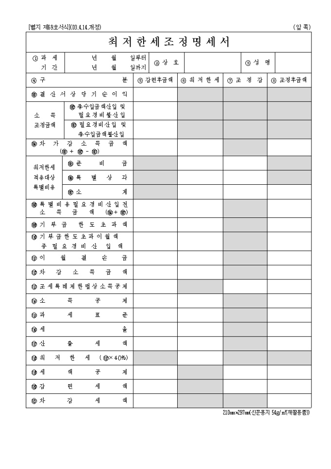 9,000원/월별지 제69호 최저한세조정명세서로 구분,감면후금액,최저한세,조정감,조정후금액으로 구성되어 있습니다. (2003.4.14.개정)