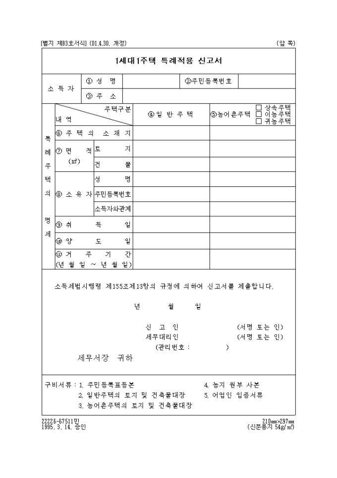 소득세법시행령 제155조제13항의 규정에 의하여 1세대1주택특례적용신고할때 사용하는 양식입니다.