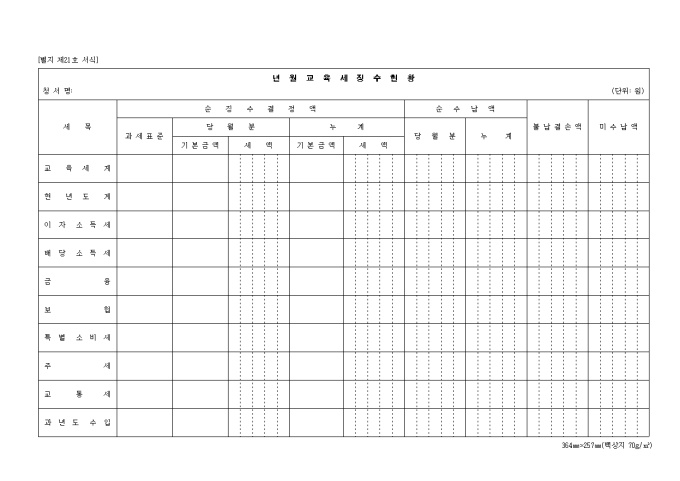 9,000원/월제21호 년월 교육세 징수현황 양식입니다. 세목에 따른 순징수 결정액, 순수납액, 불납결손액, 미수납액 등을 기재합니다.