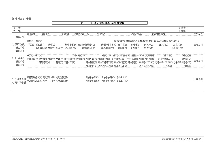 9,000원/월제21호 등기 양도 자료 오류 일람표 양식입니다. 1. (토기)순번 양도사항 취득사항 2. 건물(순번) 양도사항 취득사항 3. 의무자순번 4. 권리자순번