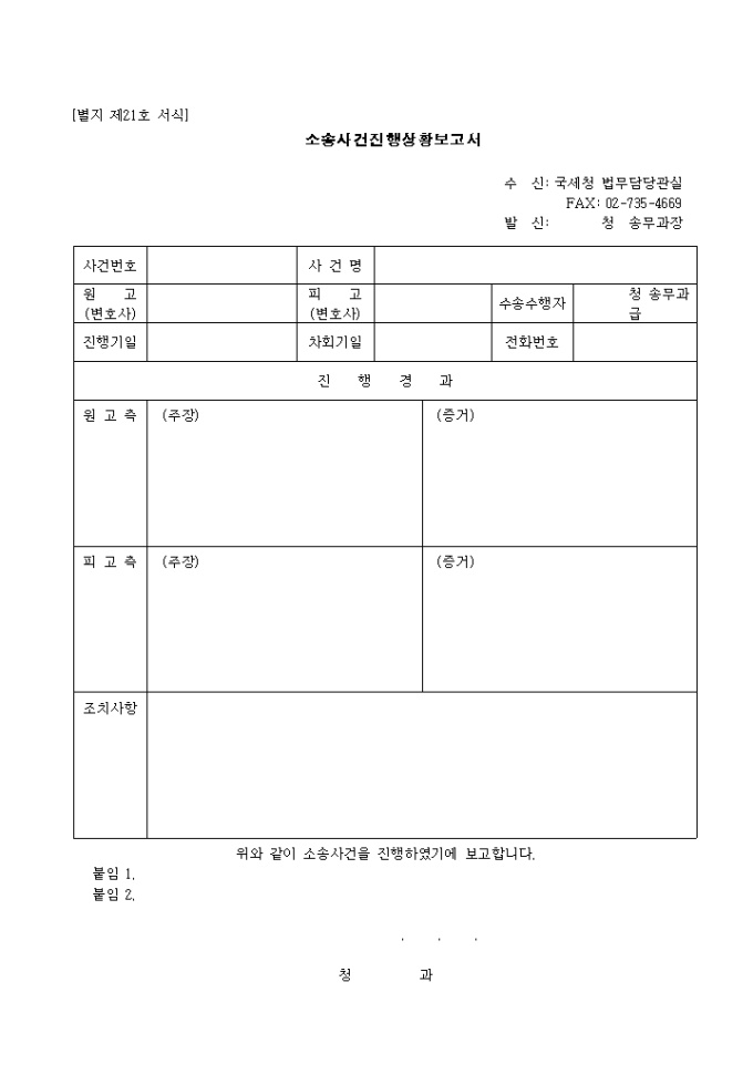 사건번호, 사건명, 원고, 피고, 진행기일, 진행경과등을 기입하여 보고하는 양식입니다.