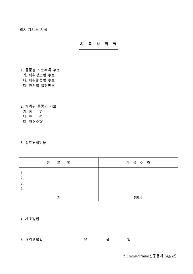 제21호 시료채취표 양식입니다.