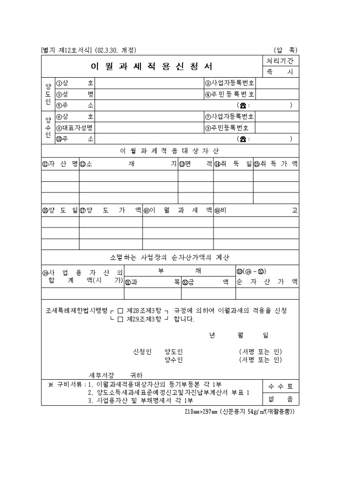 9,000원/월양도인,양수인 인적사항과 이월과세적용대상자산 내역을 기록하는 제12호 이월과세적용신청서입니다. (2002.3.30. 개정)
