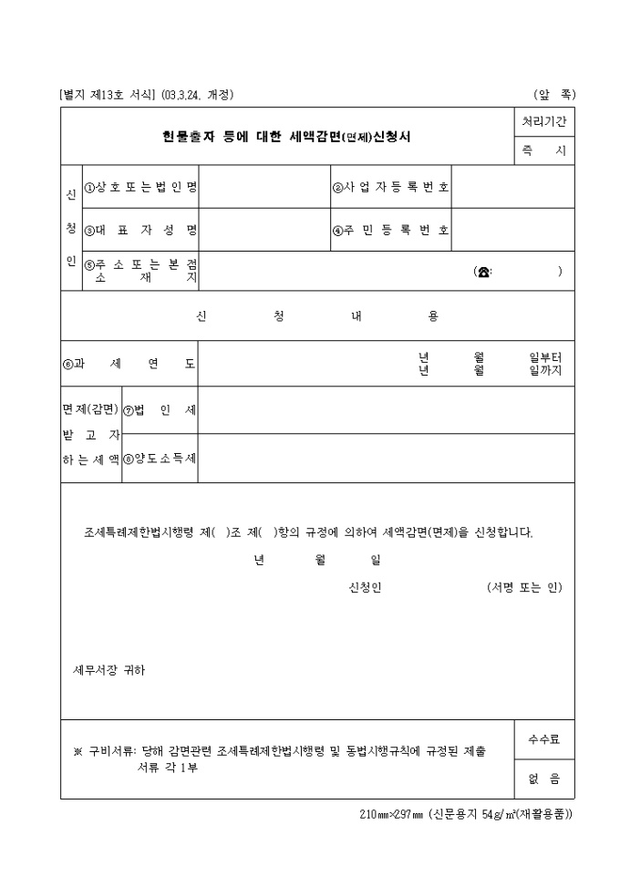 9,000원/월신청인 인적사항,면제받고자 하는 세액을 기록하는 제13호 현물출자등에대한세액감면(면제)신청서입니다. (2003.3.24. 개정)