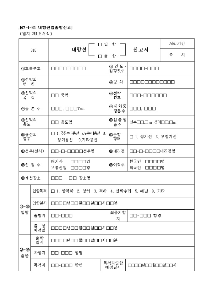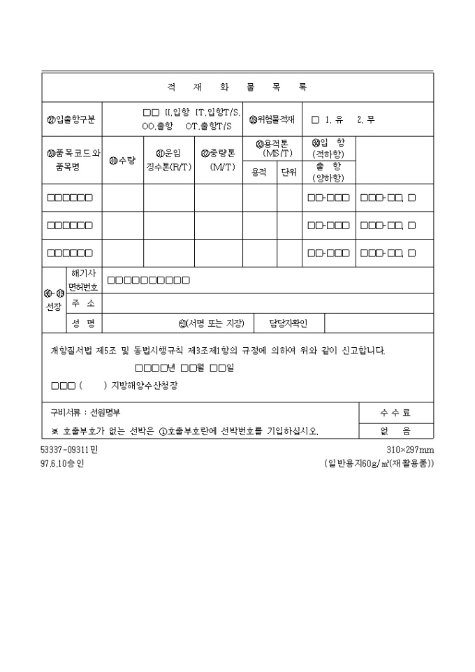 9,000원/월개항질서법 제5조 및 동법시행규칙 제3조제1항의 규정에 의하여 위와 같이 신고하고자 할 때 사용하는 "내항선 (입항,출항)신고서" 양식입니다.
