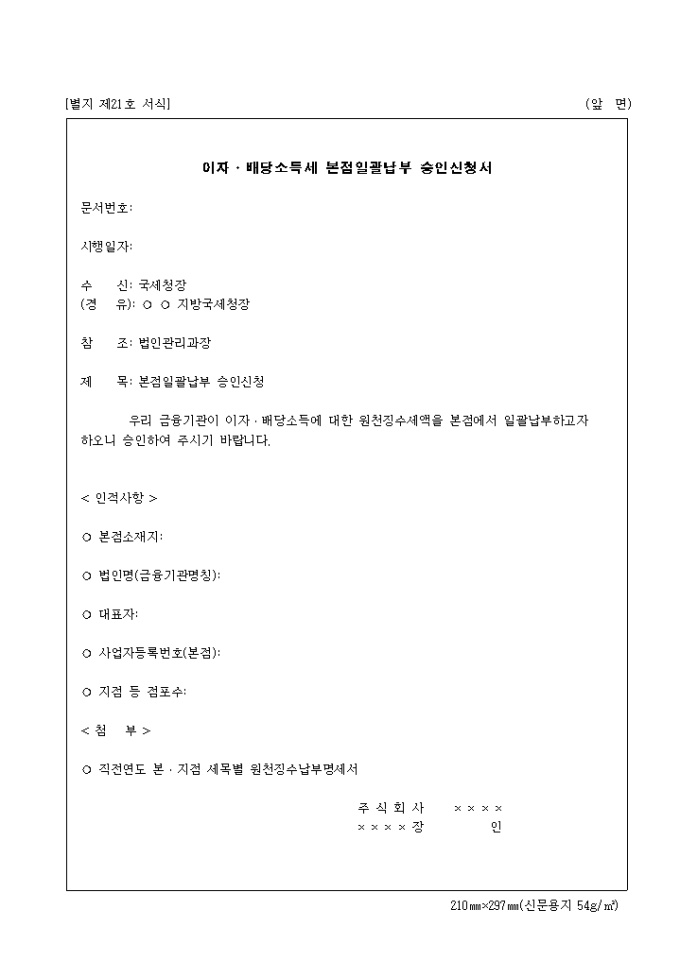 9,000원/월제21호 이자.배당소득세 본점일괄납부승인신청서 양식입니다. 문서번호, 시행일자, 수신, 참조, 제목 등을 기재합니다.