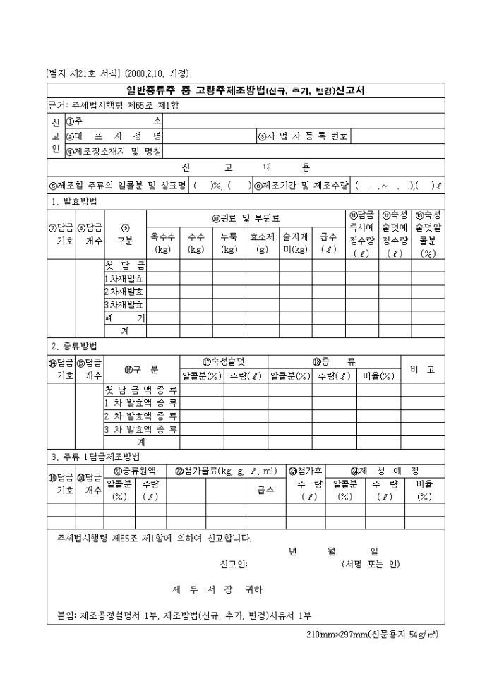제21호 일반증류주 중 고량주제조방법(신규, 추가, 변경)신고서(2000.2.18. 개정)