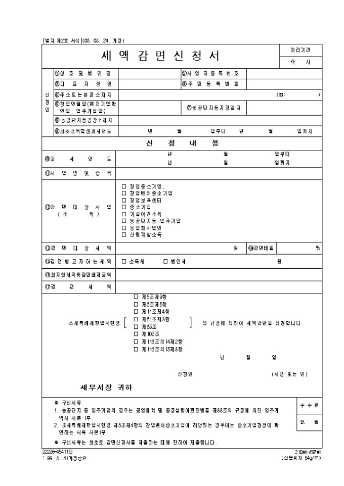 9,000원/월조세특례제한법시행령 제5조제9항,제5조제9항,제11조제4항,제61조제3항,제65조,제102조,제116조의14제2항,제116조의15제3항 규정에 의하여 세액감면을 신청할때 사용합니다.