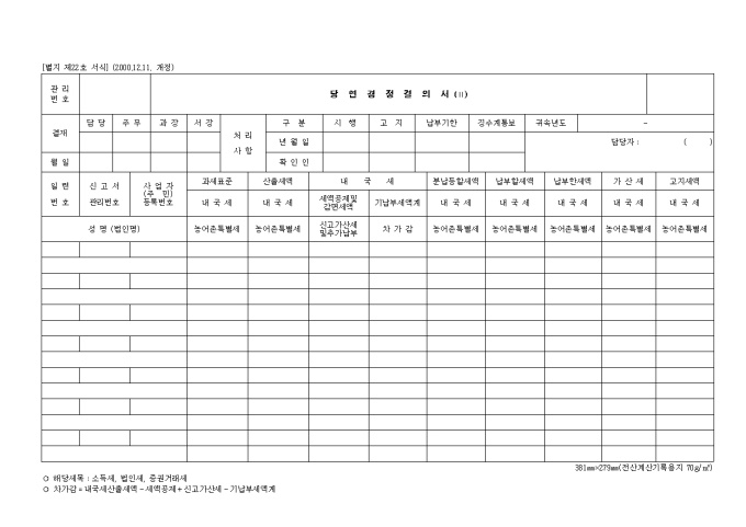 9,000원/월제22호 당연경정결의서(Ⅱ) (2000.12.11. 개정) 양식입니다. 일련번호, 신고서 관리 번호 사업자 등록번호, 과세표준, 산출세액, 내국세, 분납등할세액, 납부할세액, 납부한세액, 가산세, 고지세액 등을 기재합니다.