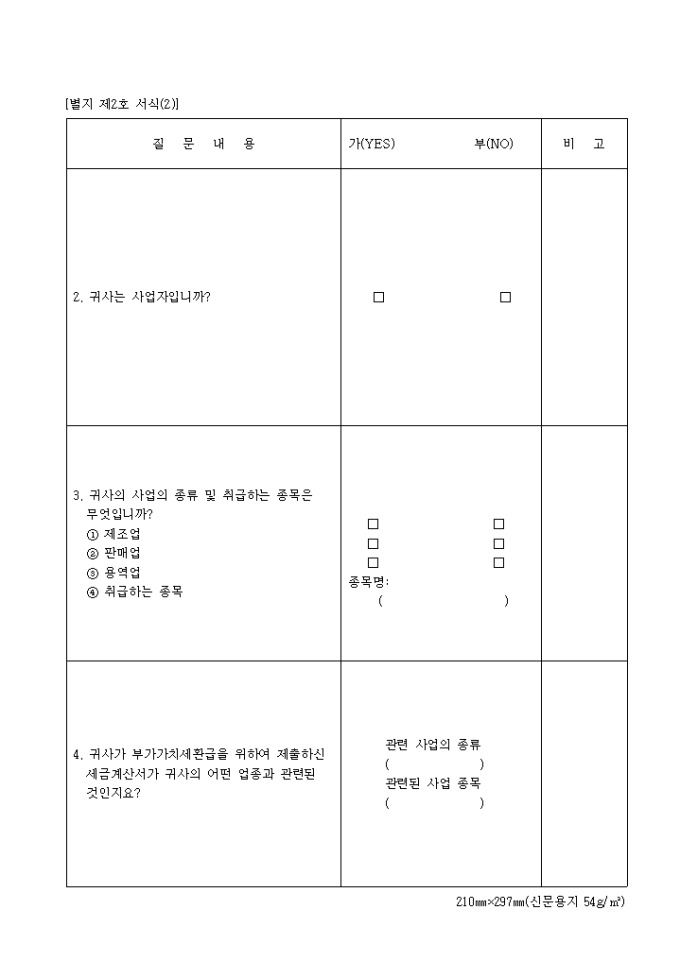 9,000원/월제2-2호 질문내용 입니다. 질문내용에 따라 yes. no로 표기하고, 비고를 작성합니다.