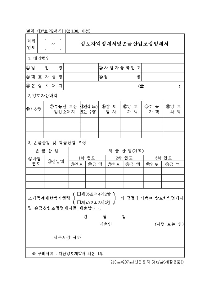 9,000원/월제37호의2 양도차익명세서및손금산입조정명세서로 대상법인 인적사항,양도자산내역,손금산입 및 익금산입 조정내역을 기록합니다. (2002.3.30. 개정)