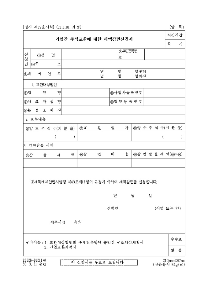 기업간주식교환에 대한 세액감면신청서(제39호)(2002.3.30. 개정)