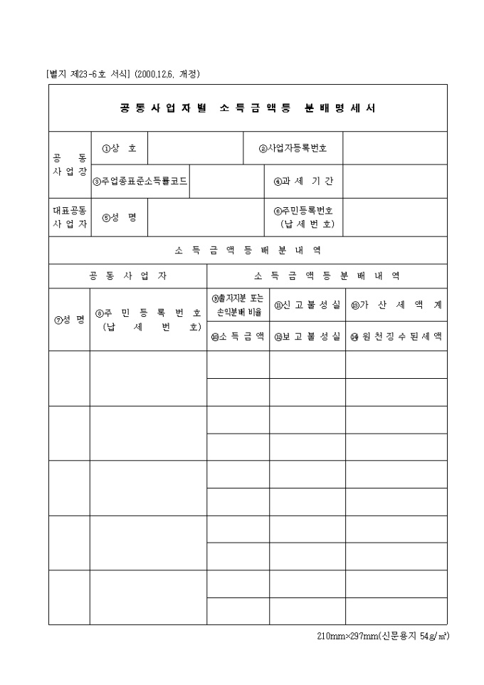 제23.6호 공동사업자별 소득금액 등 분배명세서(2000.12.6. 개정)