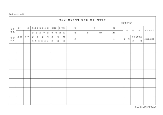 9,000원/월제23호 국고금 송금 통지서 반송분보관처리대장 양식입니다. 일련번호, 송금번호, 결재, 환급결정 결의일, 등기일, 등기번호, 권리, 환급액, 세목명 등을 기재합니다.
