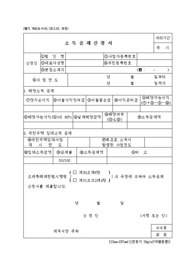 9,000원/월조세특례제한법시행령 제50조제6항,제50조제6항 의 규정에 의하여 소득공제 신청서를 제출할때 사용합니다.