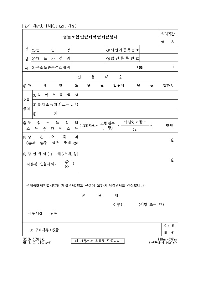 영농조합법인세액면세신청서(제47호)(2003.3.24. 개정)