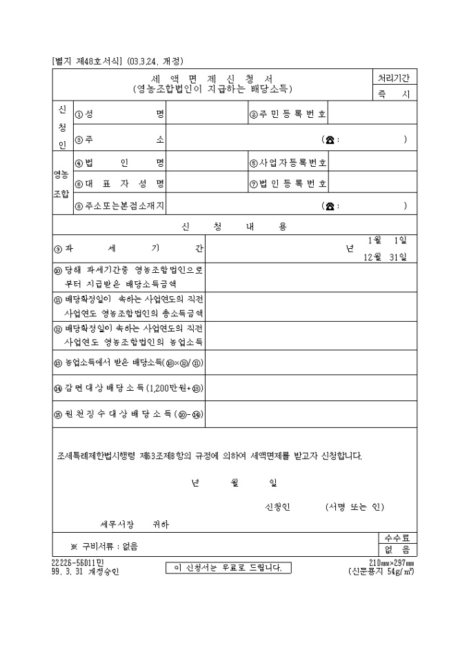세액면세신청서(영농조합법인이지급하는배당소득)(제48호)(2003.3.24. 개정)