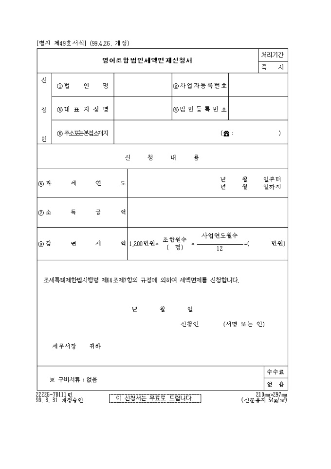 9,000원/월조세특례제한법시행령 제64조제7항의 규정에 의하여 세액면제를 신청할때 사용합니다.