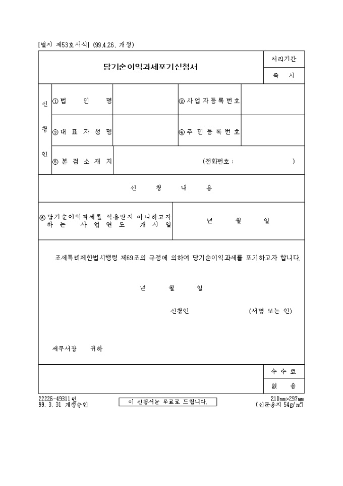 9,000원/월조세특례제한법시행령 제69조의 규정에 의하여 당기순이익과세를 포기할때 사용합니다.