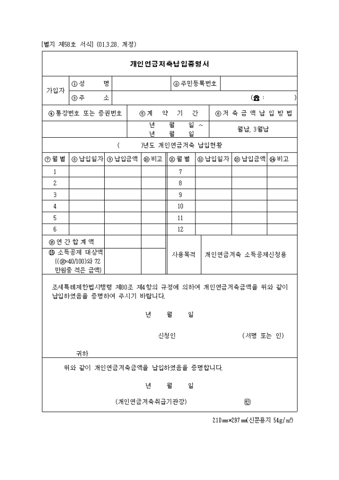 9,000원/월조세특례제한법시행령 제80조 제4항의 규정에 의하여 개인연금저축금액을 납입하였음을 증명요청할때 사용합니다.