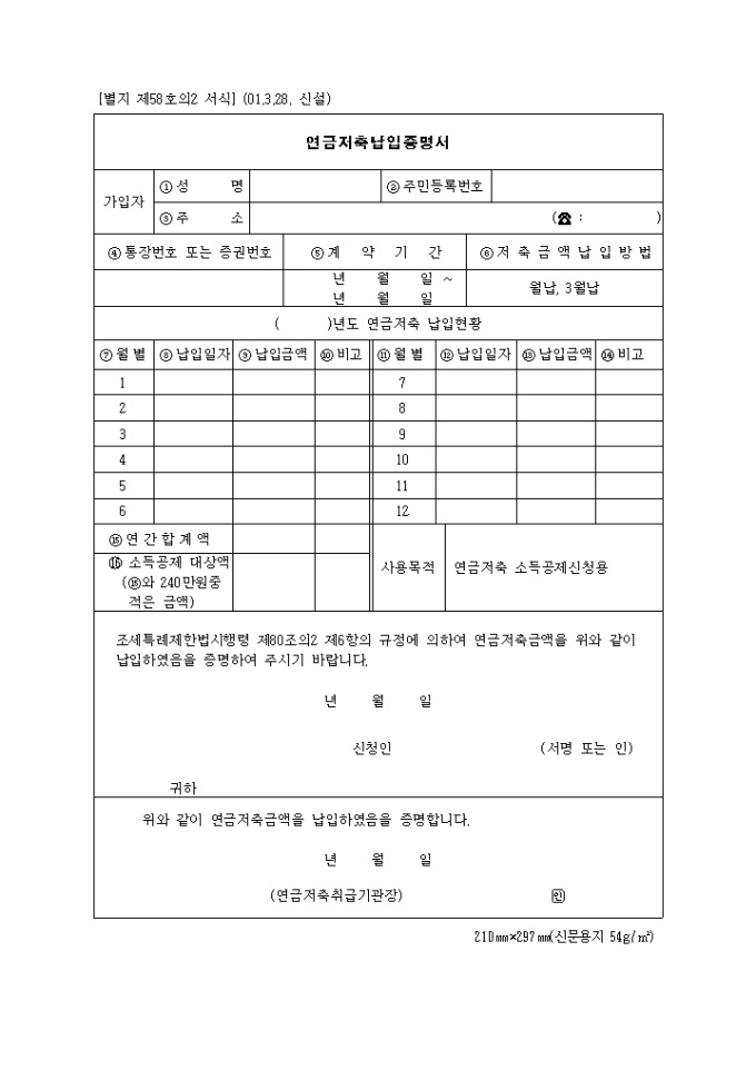 9,000원/월조세특례제한법시행령 제80조의2 제6항의 규정에 의하여 연금저축금액을 납입하였음을 증명요청할때 사용합니다.