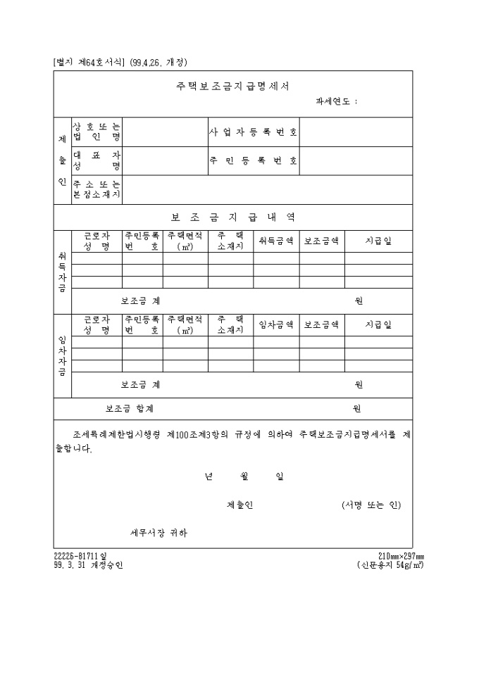 조세특례제한법시행령 제100조제3항의 규정에 의하여 주택보조금지급명세서를 제출할때 사용합니다.