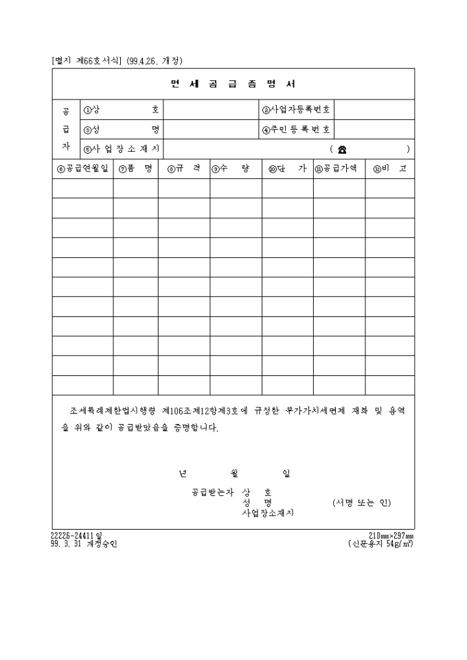 9,000원/월조세특례제한법시행령 제106조제12항제3호에 규정한 부가가치세면제 재화 및 용역을 공급받았음을 증명하는 양식입니다.
