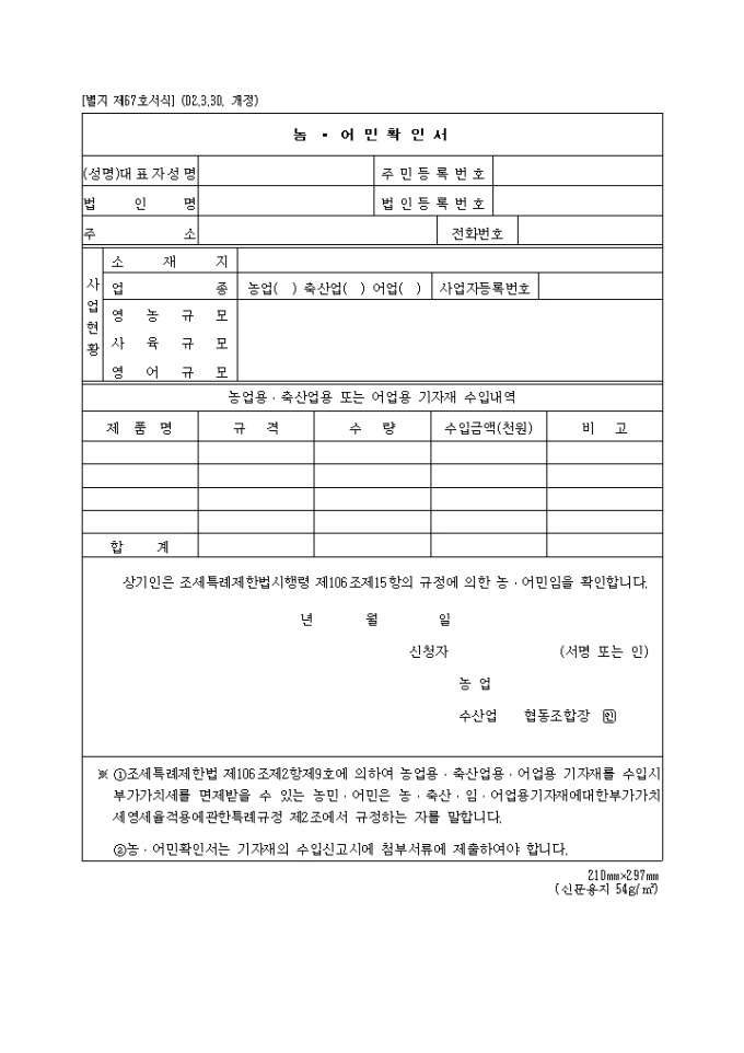 9,000원/월상기인은 조세특례제한법시행령 제106조제15항의 규정에 의한 농·어민임을 확인하는 양식입니다.