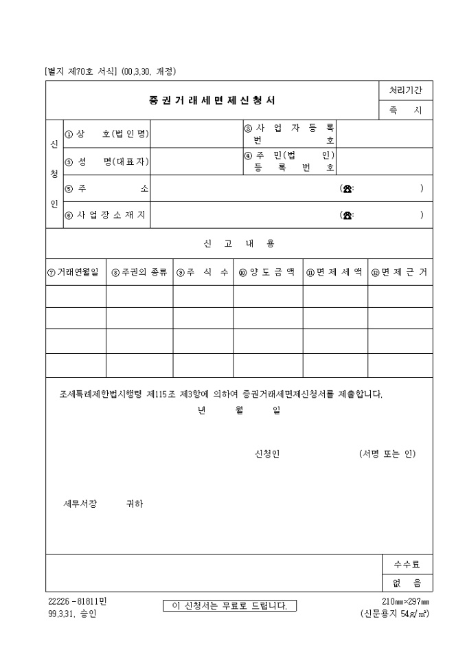 조세특례제한법시행령 제115조 제3항에 의하여 증권거래세면제신청서를 제출할때 사용합니다.