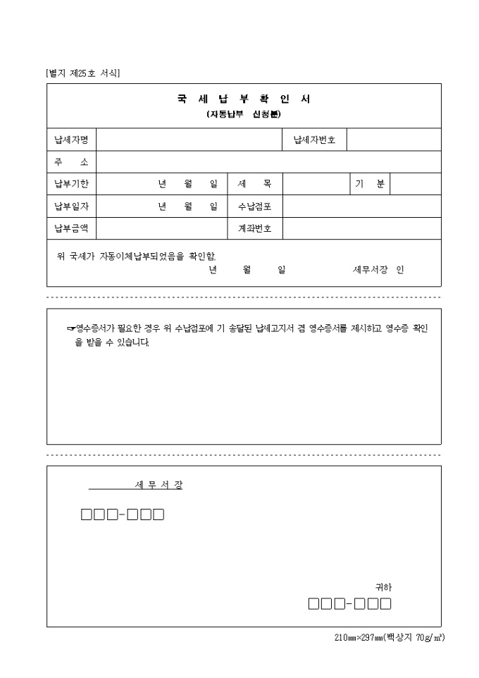 제25호 국세납부확인서 ☞영수증서가 필요한 경우 위 수납점포에 기 송달된 납세고지서 겸 영수증서를 제시하고 영수증 확인 을 받을 수 있습니다.