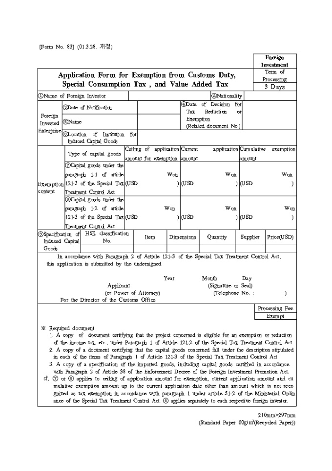 9,000원/월영문으로 된 제83호 관세.특별소비세.부가가치세면제신청서입니다.(Application Form for Exemption from Customs Duty, Special Consumption Tax, and Value Added Tax) (2001.3.28. 개정)