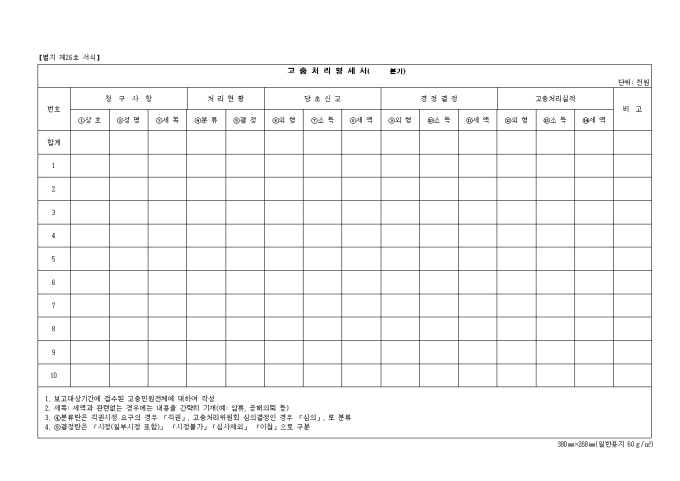 9,000원/월제26호 고충 처리 명세서( 분기) 양식입니다. 청구사항, 처리현황, 당초신고, 경정결정, 고충처리 실적, 비고 등을 기재합니다.