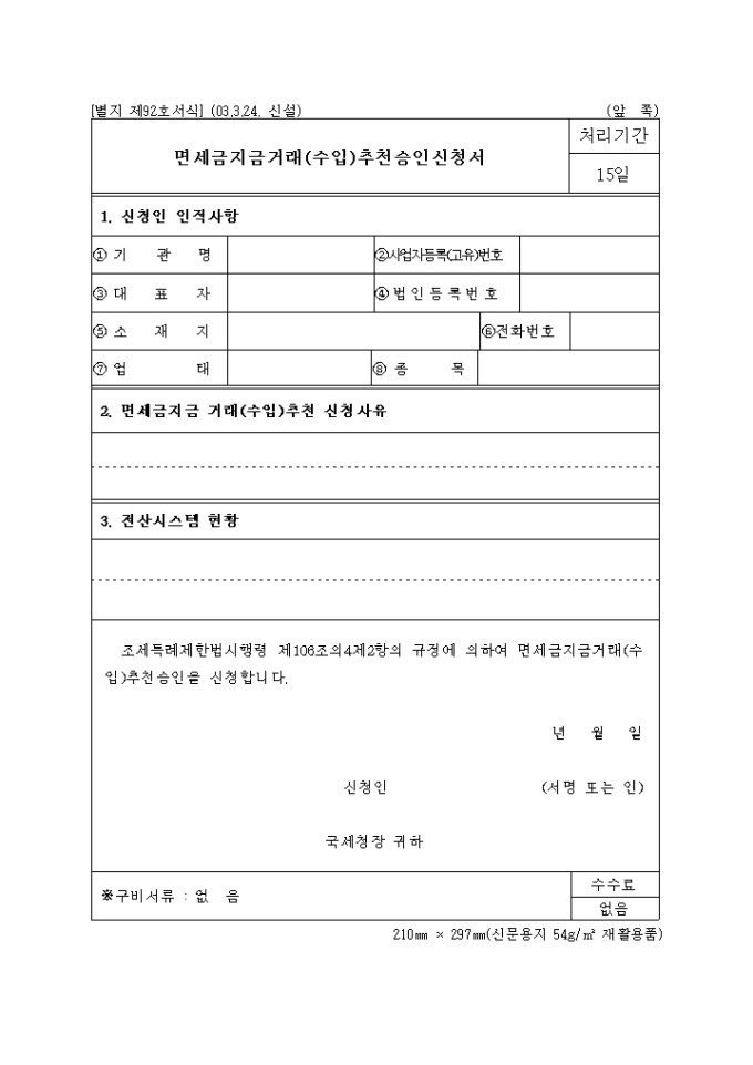 면세금지금거래(수입)추천승인신청서(제92호)(2003.3.24. 신설)