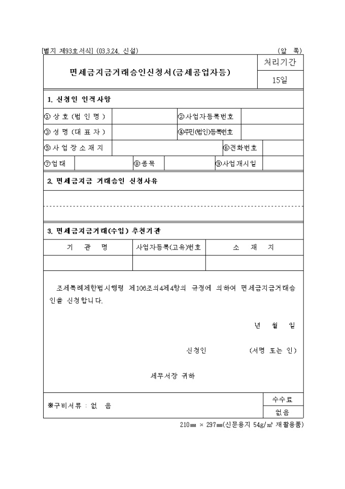 9,000원/월조세특례제한법시행령 제106조의4제4항의 규정에 의하여 면세금지금거래승인을 신청할때 사용합니다.
