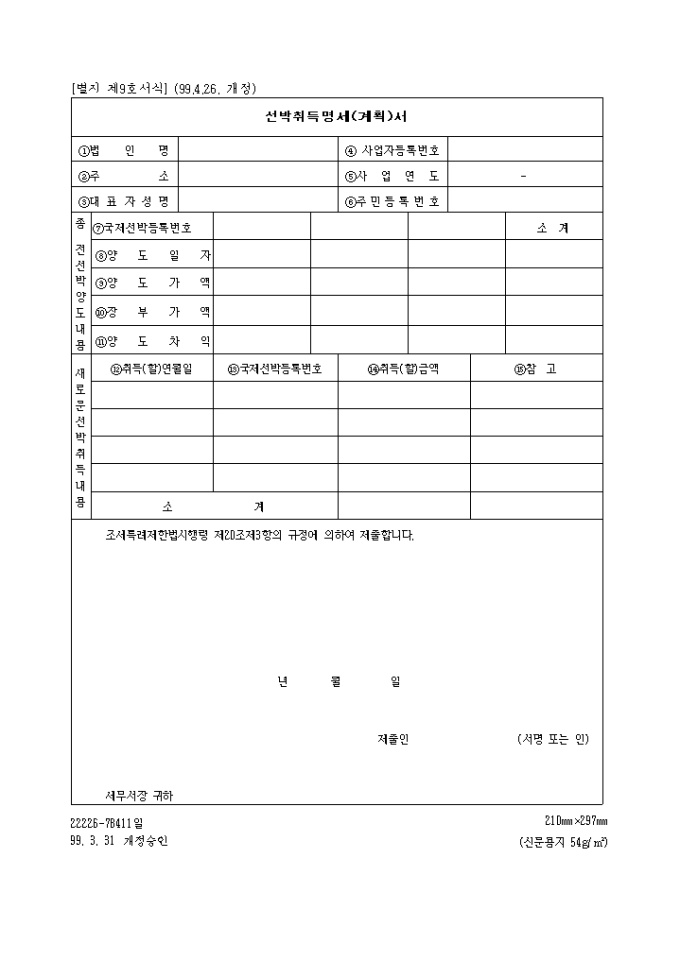 세특례제한법시행령 제20조제3항의 규정에 의한 제9호 선박취득명세(계획)서입니다.(1999.4.26. 개정)