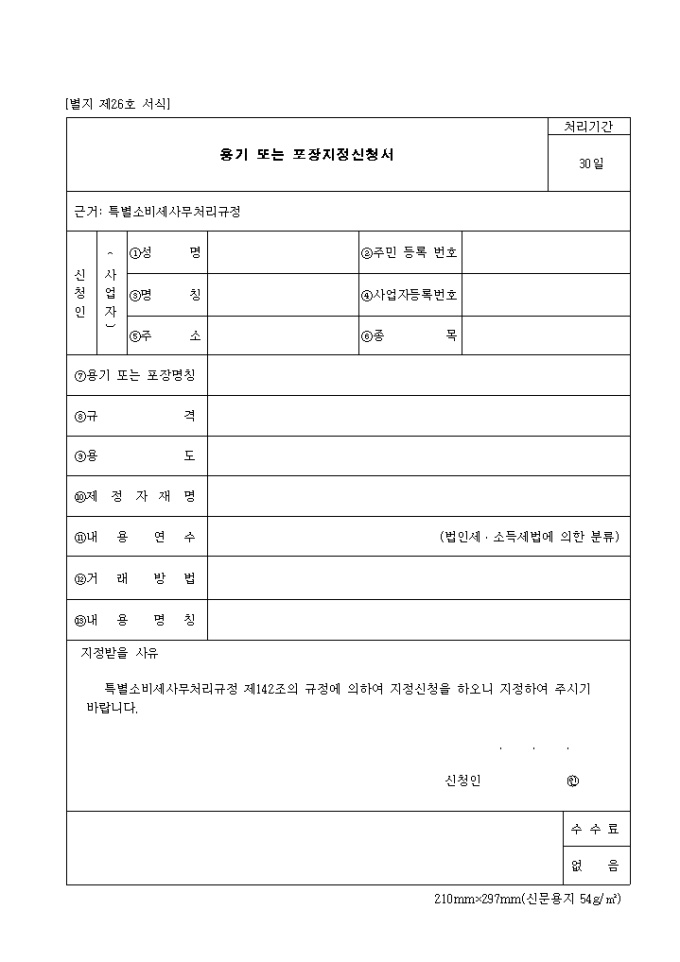 9,000원/월제26호 용기 또는 포장지정 신청서 양식입니다. 성명, 주민등록번호, 명칭, 사업자 등록번호, 주소, 종목, 용기 또는 포장명칭, 규격, 용도, 제정자 재명, 내용 연수, 거래방법, 내용 명칭 등을 기재합니다.