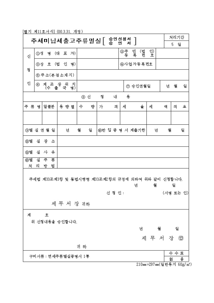 주세법 제33조제3항 및 동법시행령 제33조제2항의 규정에 의한 제11호 주세미납세출고주류멸실승인신청서(승인서)로 신청인 인적사항,멸실주류내용을 기록합니다. (2000.3.31. 개정)