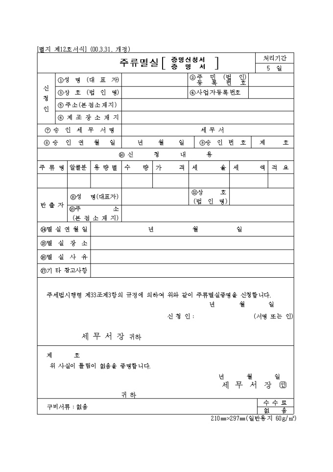 9,000원/월주세법시행령 제33조제3항의 규정에 의한 제12호 주류멸실증명신청서(증명서)로 멸실주류내용을 기록합니다.(2000.3.31. 개정)